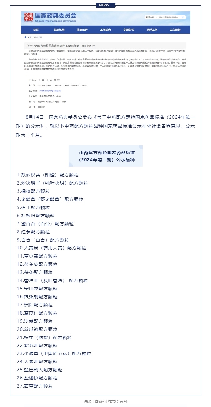 關(guān)于中藥配方顆粒國家藥品標(biāo)準(zhǔn)(2024年第一期)的公示