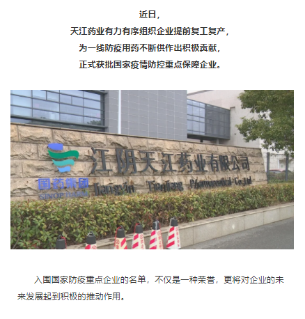 復(fù)工有力!天江藥業(yè)獲國(guó)家認(rèn)可