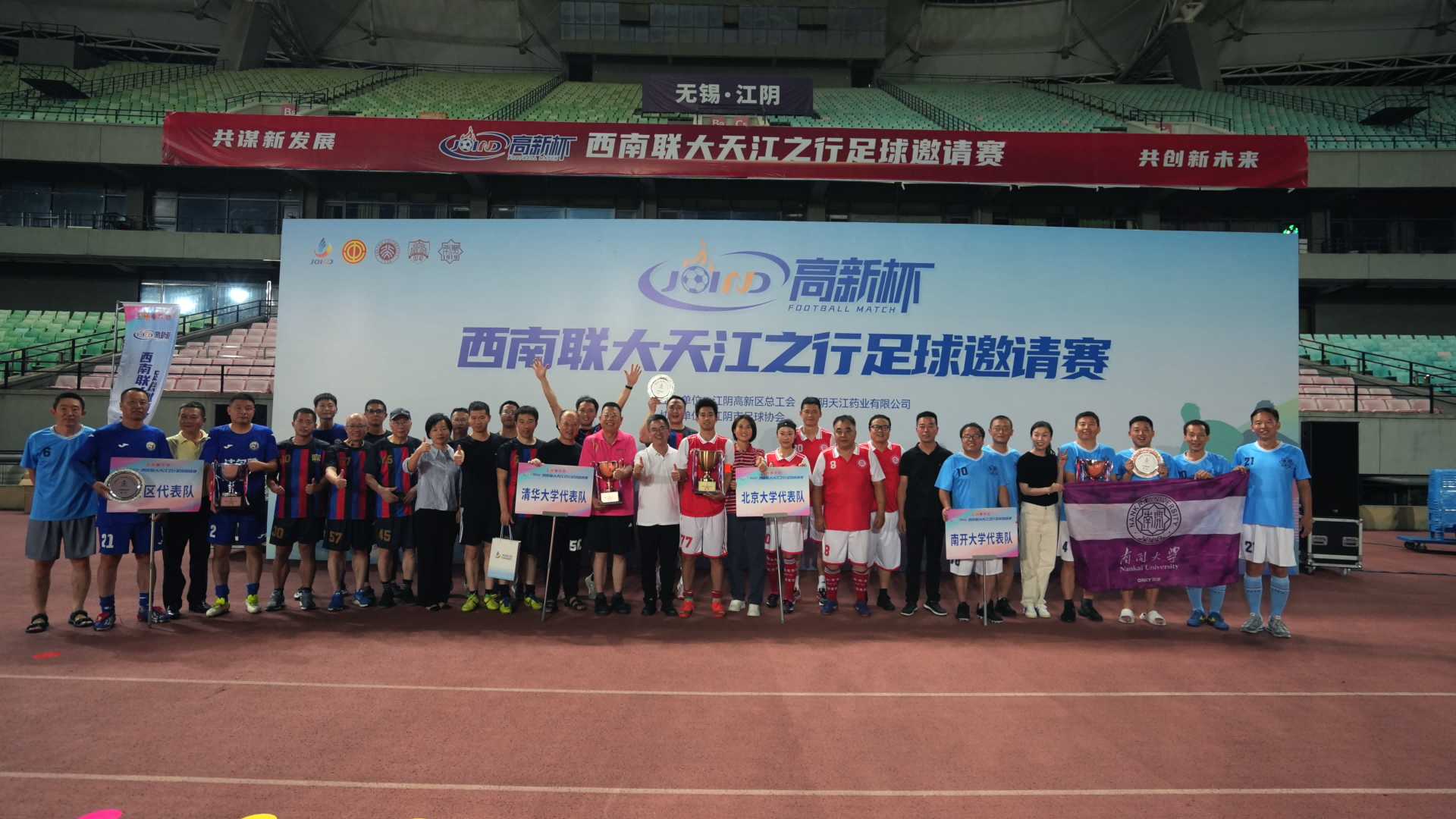 以球會友促交流,以賽傳情展風采。8月19日傍晚,在嘹亮的國歌聲中,“高新杯”西南聯(lián)大天江之行足球邀請賽在期待中正式拉開序幕。賽場上,三校球員們?nèi)ζ床?,展現(xiàn)了三校的優(yōu)秀的競技水平與良好的精神風貌。揭幕戰(zhàn)中,北京大學隊與清華大學隊1比1握手言和,并在接下來的“點球大戰(zhàn)”中將全場氛圍拉滿,掌聲、喝彩聲不斷,為江陰地區(qū)市民貢獻了一場高質(zhì)量的足球盛宴。經(jīng)過兩天的激烈的角逐,各支球隊都發(fā)揚了“友誼第一、比賽第二”的體育競技精神,展現(xiàn)了運動員們的賽場激情,拼出了實力,比出了成績,也賽出了新風格。