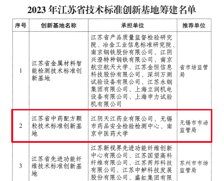 9月5日,經(jīng)江蘇省市場(chǎng)監(jiān)管局批準(zhǔn),中藥控股天江藥業(yè)、無(wú)錫市藥品安全檢驗(yàn)檢測(cè)中心、南京中醫(yī)藥大學(xué)獲批共同籌建中藥配方顆粒技術(shù)標(biāo)準(zhǔn)創(chuàng)新基地,此基地為江蘇省首個(gè)中藥領(lǐng)域技術(shù)標(biāo)準(zhǔn)創(chuàng)新基地。