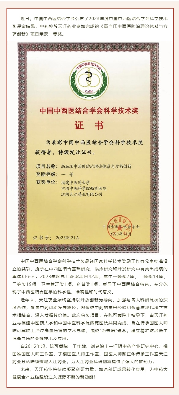 中藥控股天江藥業(yè)榮獲2023年度中國中西醫(yī)結(jié)合學(xué)會(huì)科學(xué)技術(shù)獎(jiǎng)一等獎(jiǎng)