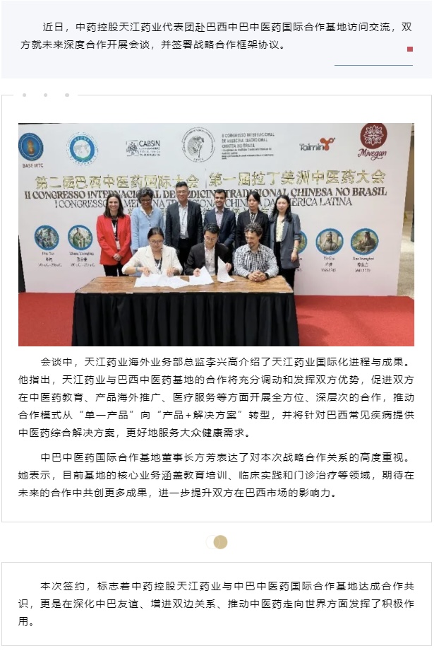 中藥控股天江藥業(yè)與中巴中醫(yī)藥國際合作基地簽署戰(zhàn)略合作框架協(xié)議