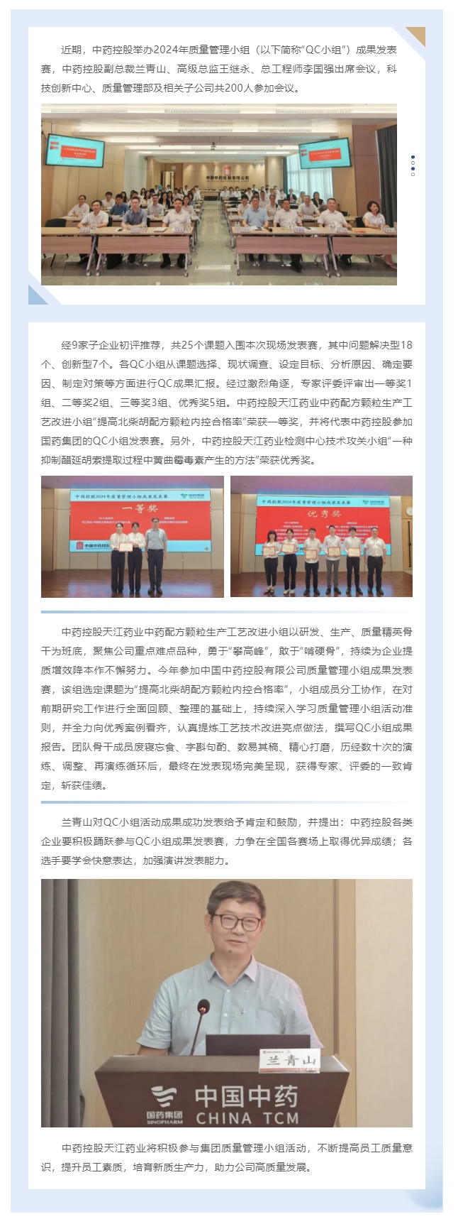 中藥控股舉辦2024年質(zhì)量管理小組成果現(xiàn)場發(fā)表賽,天江藥業(yè)斬獲佳績