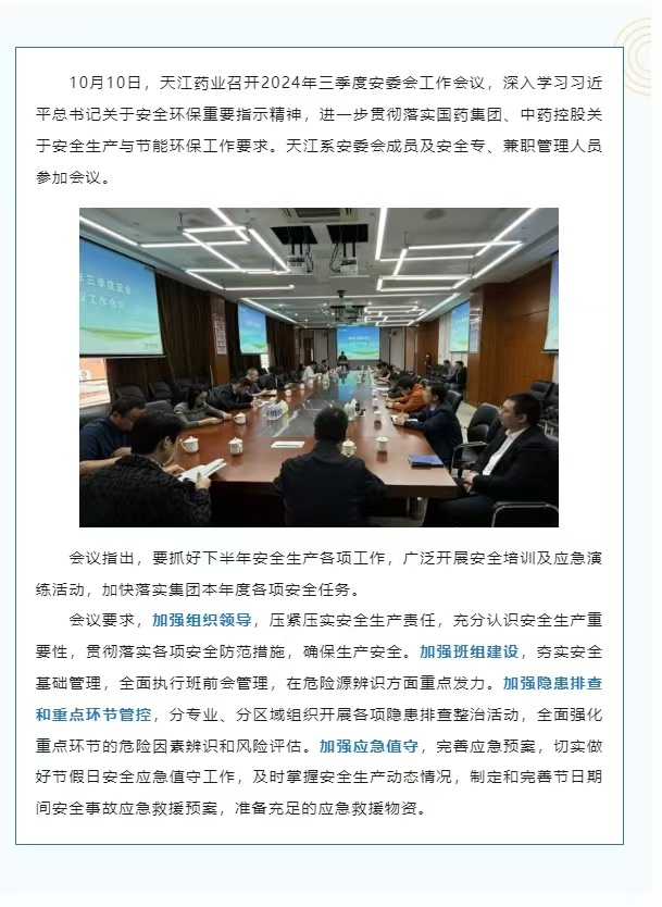 天江藥業(yè)召開2024年三季度安委會工作會議