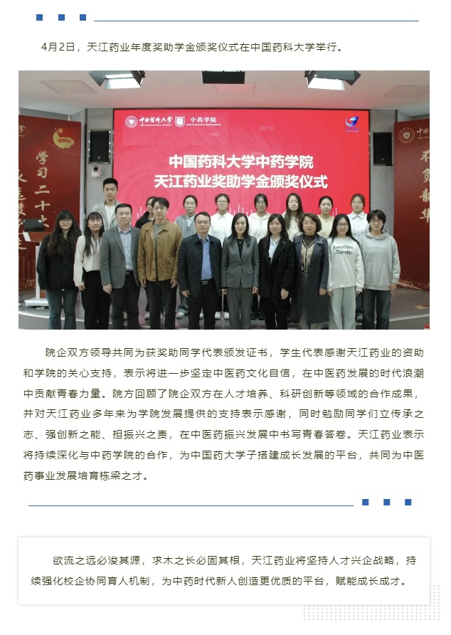 校企共育英才 攜手傳承發(fā)展——天江藥業(yè)年度獎助學(xué)金頒獎儀式在中國藥科大學(xué)舉行