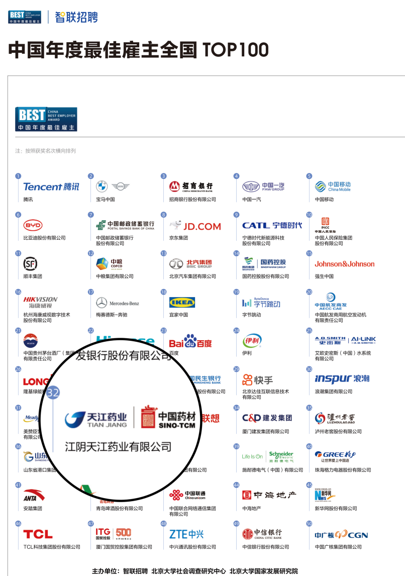 中藥控股所屬天江藥業(yè)憑借特色的雇主品牌建設(shè)體系與豐碩的雇主品牌建設(shè)成果,從超10萬家報名企業(yè)中脫穎而出,入圍2023中國年度最佳雇主全國TOP100,位列第32位,是無錫地區(qū)唯一一家上榜企業(yè)。